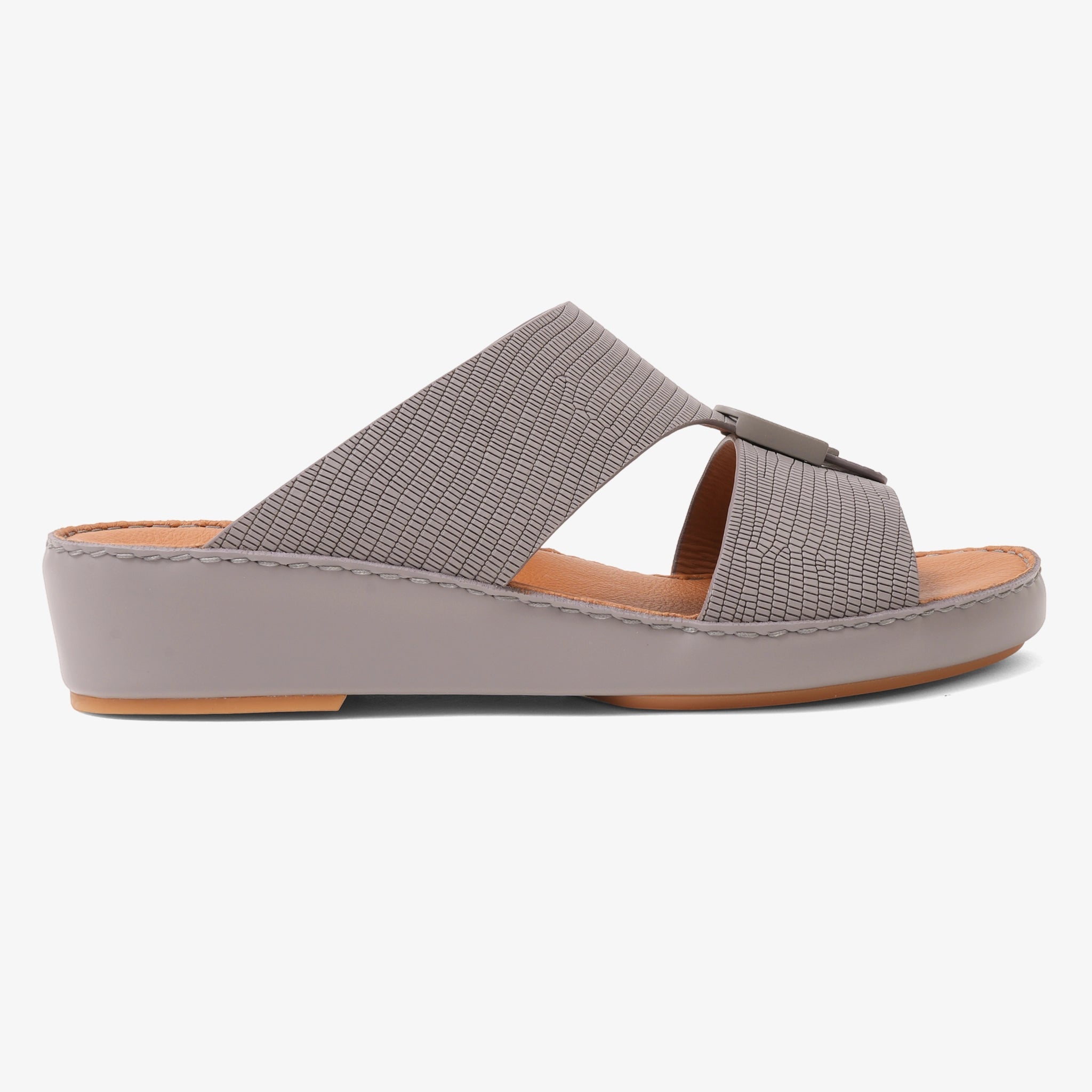 Farada's Modern classic sandals are crafted by a unique process in an Italian tannery and embellished with an Iconic Double F Trim buckle in london - sky. Farada's premium Arabic sandals are made of reptile-embedded leather. Each pair is handstitched to perfection in an ortholite insole with breathable technology for daily comfort.