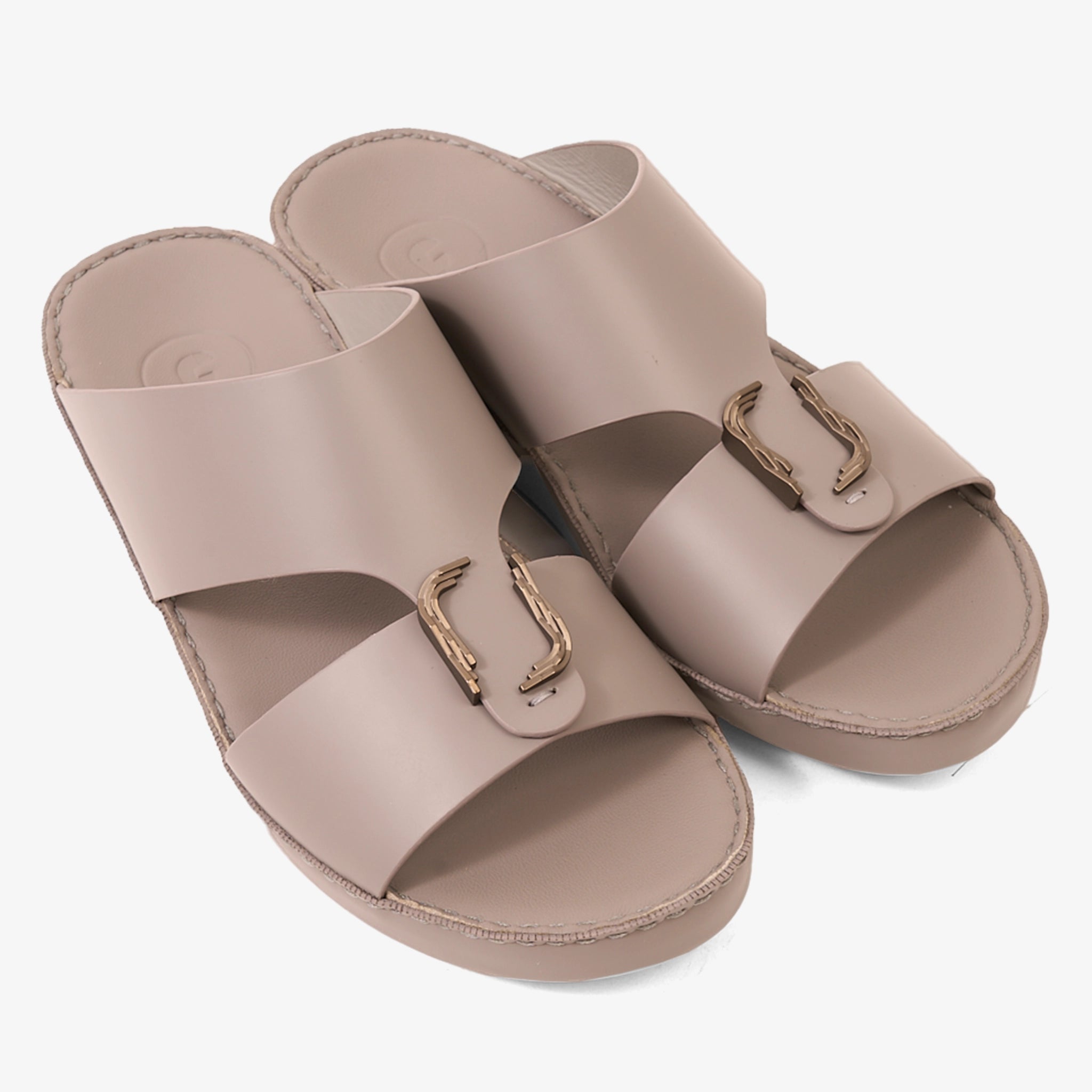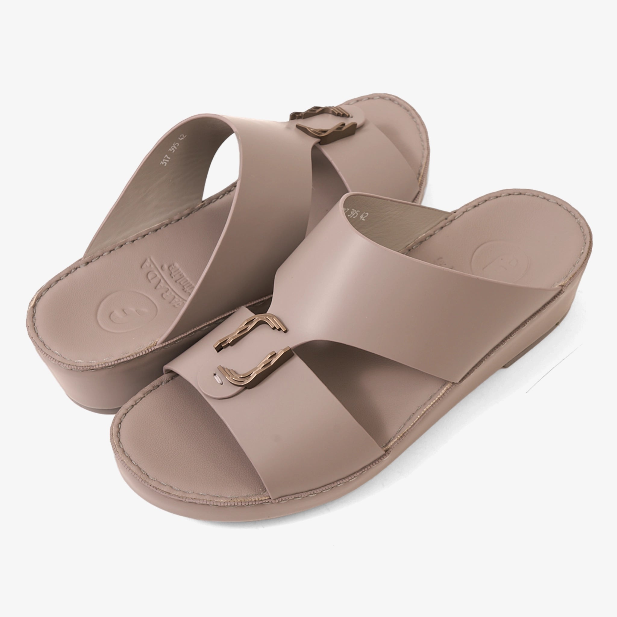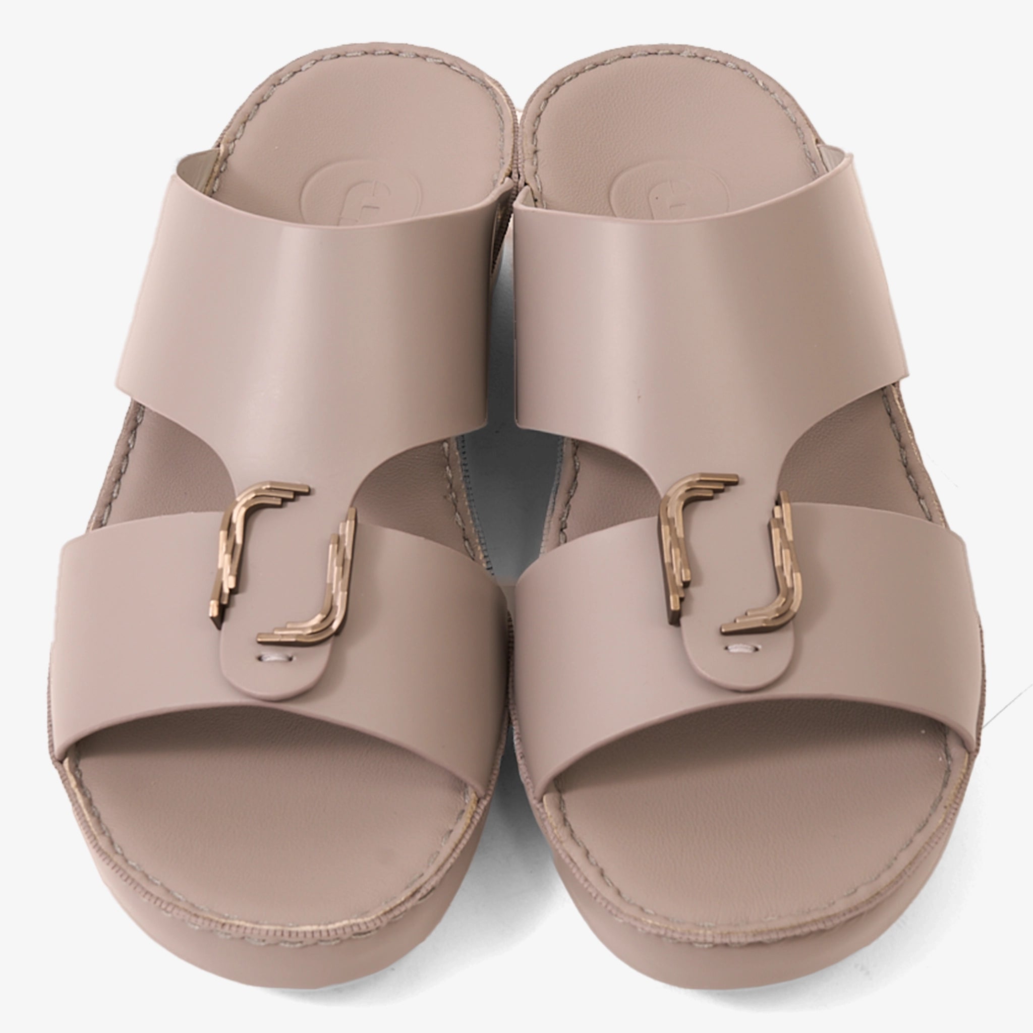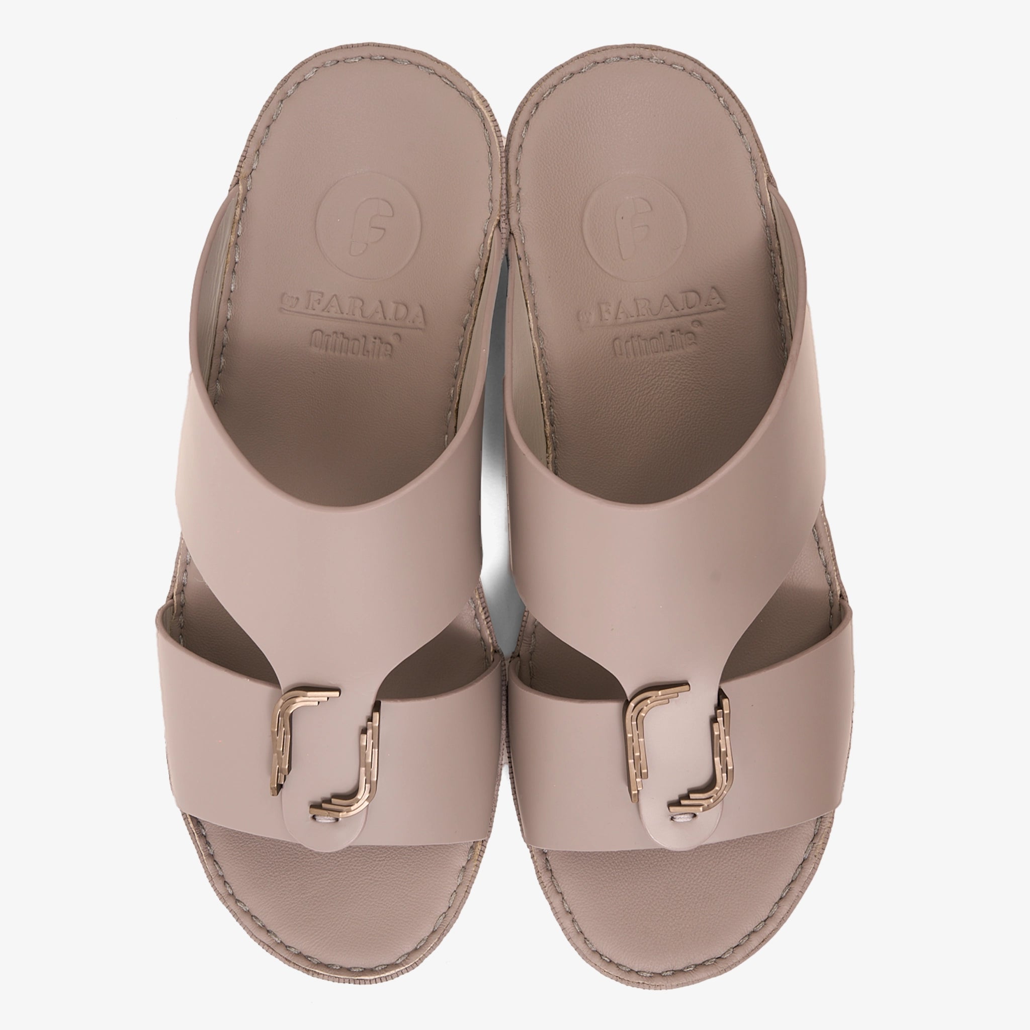 Step into contemporary elegance with the Farada Leather Arabic Sandals. These sandals feature a sleek, modern design with the signature Farada Double F trim in polished brass, adding a touch of refined detail. they offer exceptional comfort and a sophisticated look. Perfect for everyday wear or special events, these sandals effortlessly blend traditional style with modern comfort.